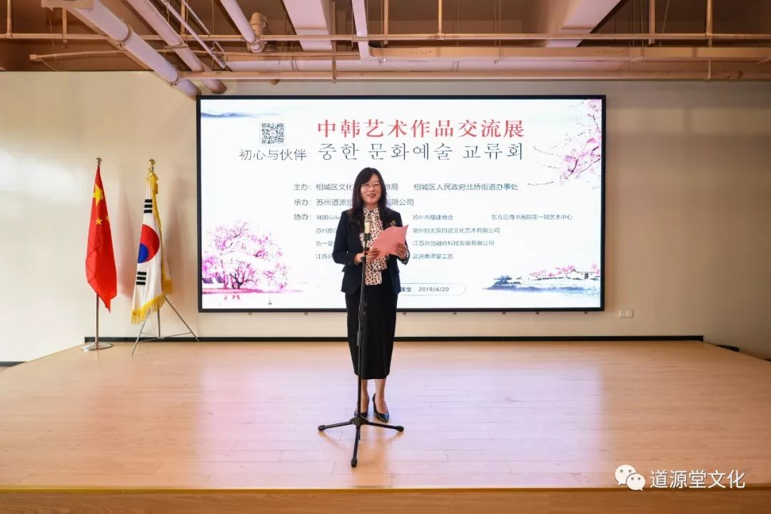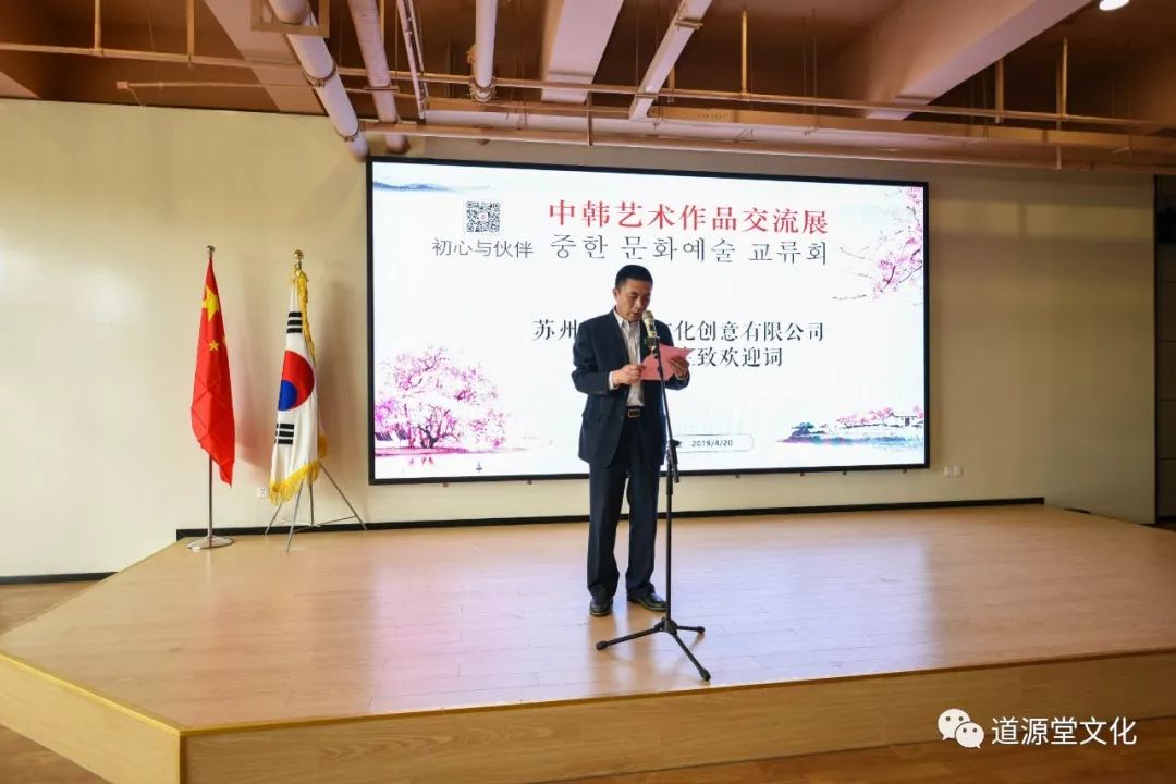 苏州道源堂文化创意有限公司总经理邵国星先生致欢迎词:邵国星先生首先对远道而来的韩国贵宾及各位领导,各位艺术家和社会各界朋友表示热烈的欢迎,艺术来源于生活却高于生活,并衷心祝愿各位艺术家能够通过此次艺术作品交流活动,达到相互学习,相互借鉴,取长补短,创造出更多的优秀作品,为人类精神文明建设再创辉煌。最后感谢相城区文化体育和旅游局,及相城区北桥街道的精心组织和大力支持,感谢苏州大师谷文化发展有限公司的全力支持,感谢所有到场的各位领导、艺术家、和社会各界朋友的光临和指导。